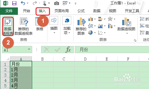 我们可以在此中肆意一张空白工作表中建立1月-12月这一列数据,见下图一,然后依次点击“插入”-“数据透视表”;