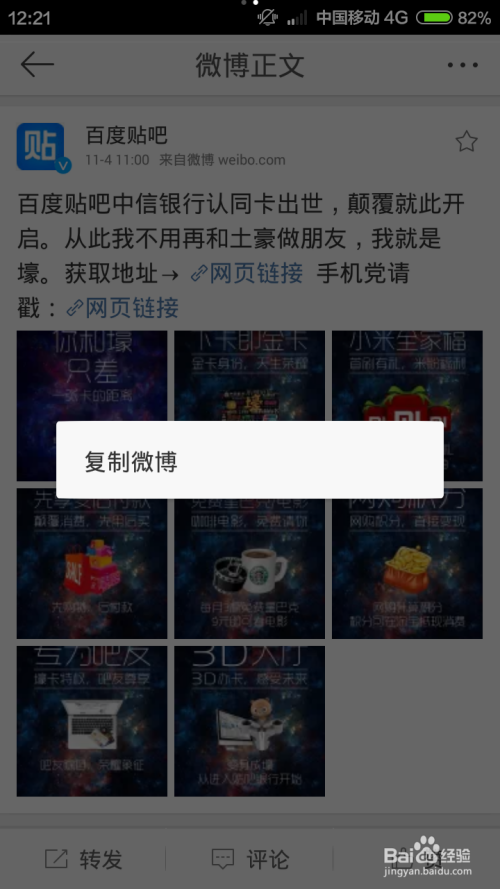 新浪微博客户端很是便利我们查看来自我们存眷的微博用户,看到一段很是经典的微博的时辰,有没有想过将其复制下来呢?那么在本篇经验中我将为大师具体介绍一下如何复制其正文,大师速来围不雅我的经验啦。