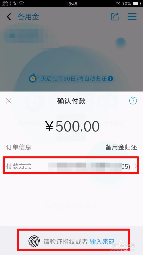 在确认付条目的窗口选择一个付条目体例、并输入密码(有指纹密码的,也可以验证指纹密码)。如图所示