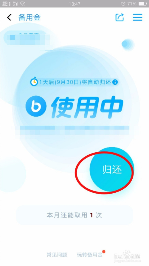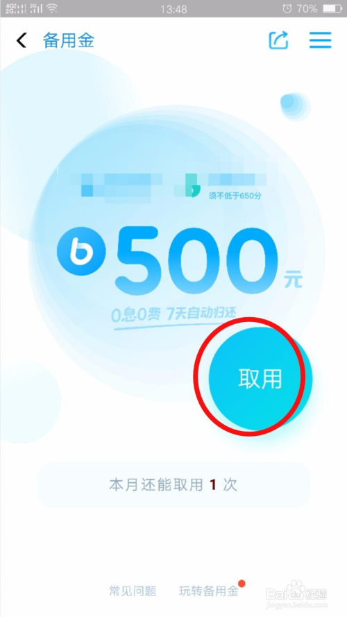 还条目当作功了之后,回到备用金界面点击【取用】,领取当月的第二笔备用金。如图所示