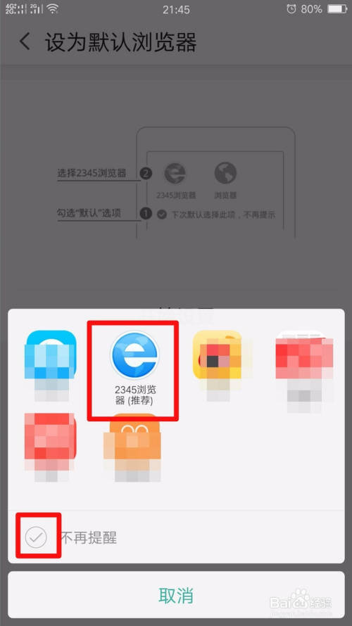 选择一个需要设置为默认浏览器的浏览器、并勾选左下方不再提醒,期待页面跳转就,按照要求操作就可以了。