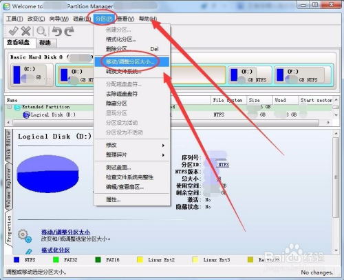 方式二:单击分区菜单,选择移动/调整分区大小选项。