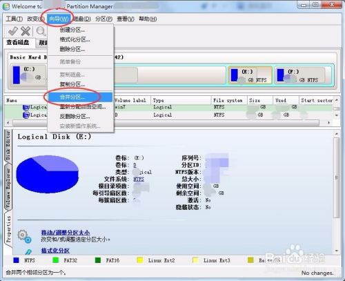 单击标的目的导菜单,下拉菜单中选择归并分区,可以将两个分区归并,我们可以用此功能将切割出的空白分区归并到原有分区。