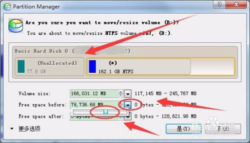 单击Volume size选项后的倒三角,呈现拖动块后拖动,可以直接改变所选分区的大小 。