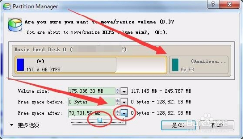 拖动Free space after选项的滑块,可以切割所选分区的空白空间,切割出的分区放置在原分区之后。