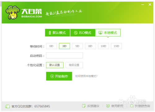 下载安装年夜白菜PE后,打开年夜白菜软件。注重:选择当地模式!