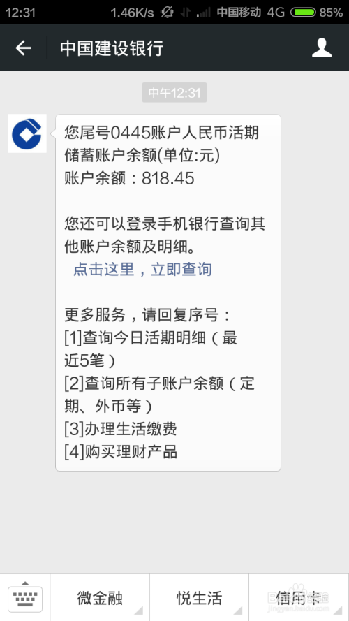 存眷公家号码今后,进入号码详情页,点击“微金融”,然后选择“账户查询”。
