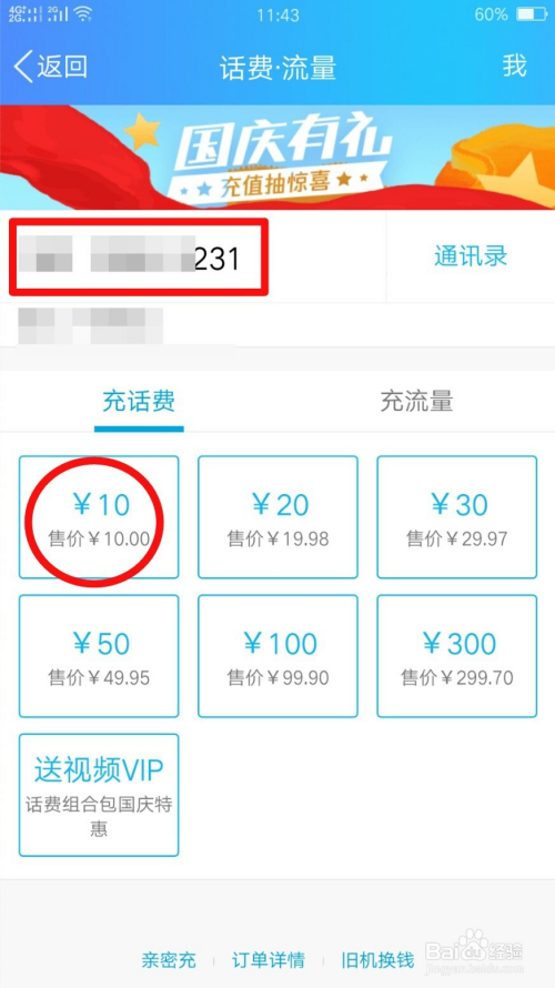 再接着选择或者输入一个需要充值的手机号,并选择一个金额。如图所示