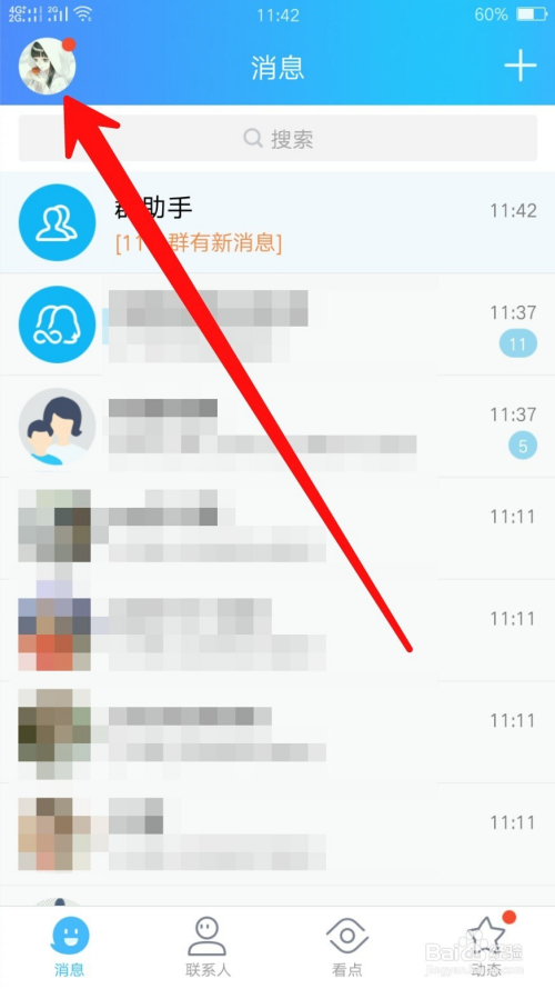 首先,我们需要登录QQ软件之后,在首页点击左上角的小我头像。如图所示
