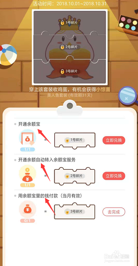 而此次的使命其实很是好做,一般环境下前两项都已经是开经由过程的,就剩下最后一个用余额宝付出一下就可以了。等付出完当作后点击后边的当即兑换。上方的碎片就亮了。