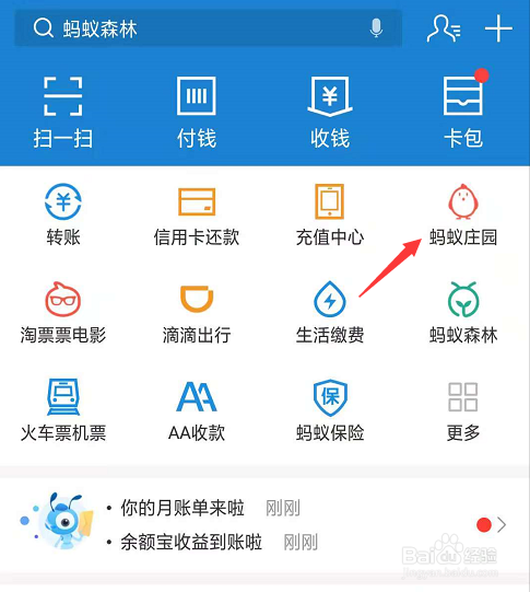 首先我们打开付出宝,在常用东西栏中点击蚂蚁庄园。如图