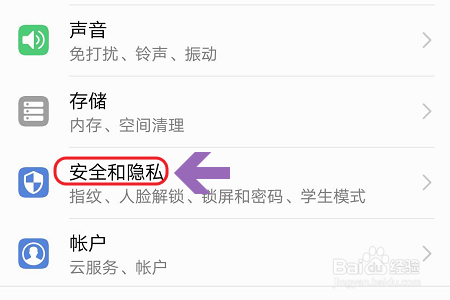 点击之后,找到“平安和隐私”选项,在平安和隐私界面中我们即可看到“学生模式”了,一般来说系统默认是封闭的;