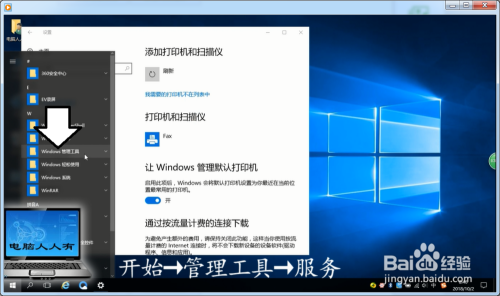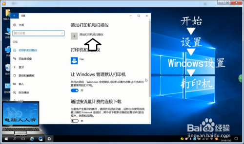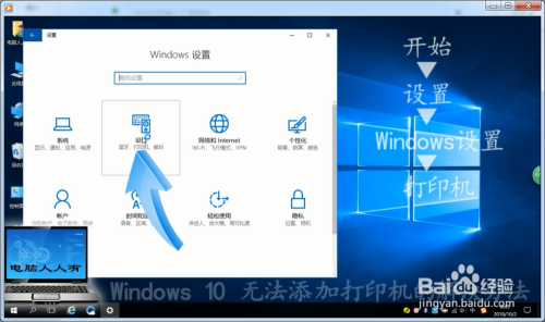 Windows 10操作系统→起头→设置→Windows设置→打印机。