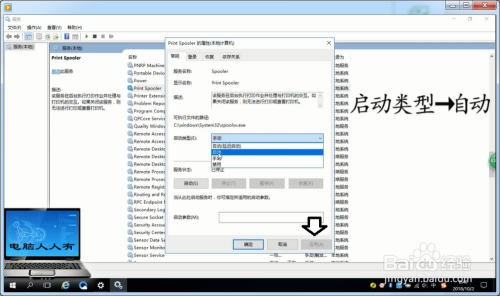 打开之后,找到Print Spooler(打印办事)→启动类型→主动→应用。