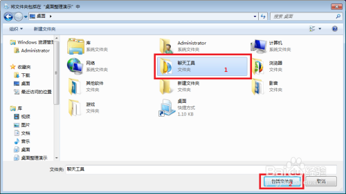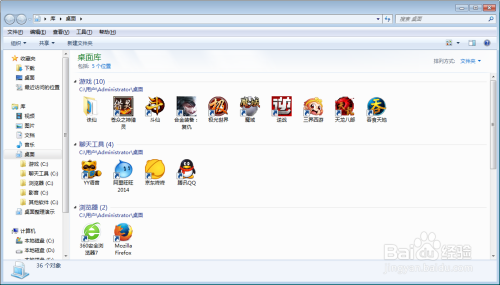 随便打开一个文件夹,在左侧找到“库”选中它后左上角会有个新建库或者在文件夹内容区”鼠标右键→新建→库“,如下图(里面的桌面是我已经建好的一个)