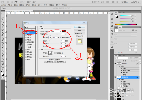 双击“MHSJS001”图层,弹出图层样式对话框。然后,别离勾选【投影】、【斜面和浮雕】、【渐变叠加】,并对其进行参数设置;
