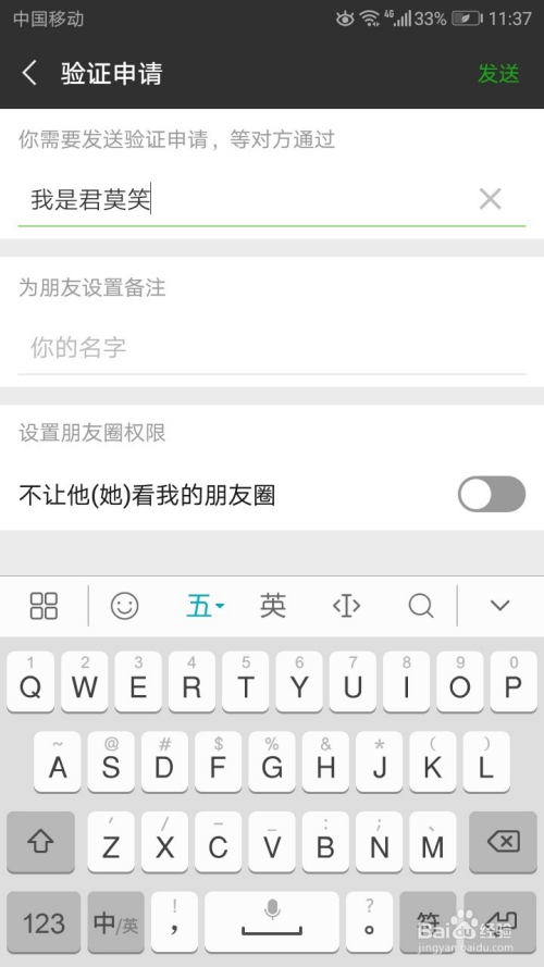 此时需要发送对方的微信验证。若是对方赞成可以私家聊天。