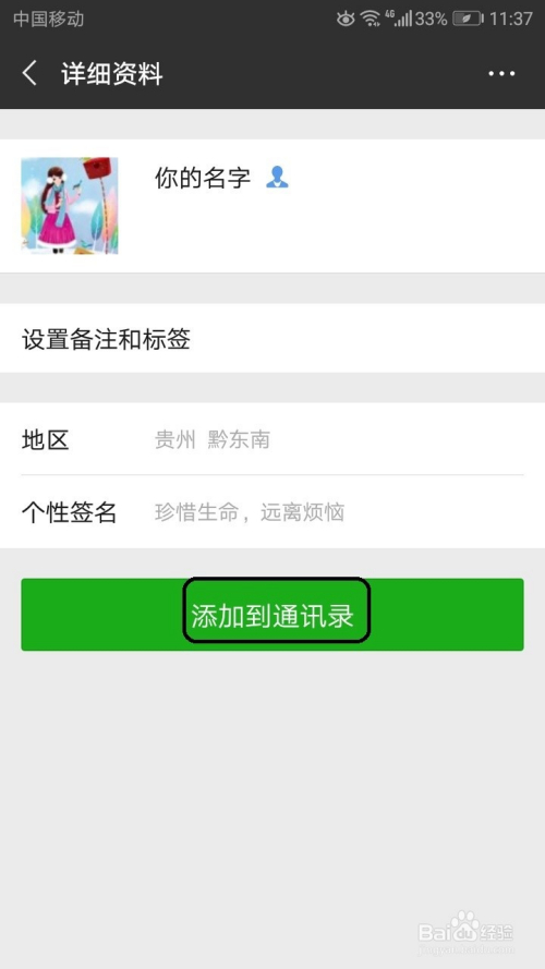 搜刮到后会有想添加的伴侣信息。在伴侣信息中点击添加到通信录按钮。