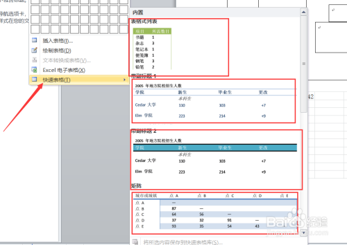 最后,为大师讲解快速表格,快速表格是word从内置的一些表格样式,好比一些新建的样式,带副题目的表格,或者矩阵表格,如下图所示。