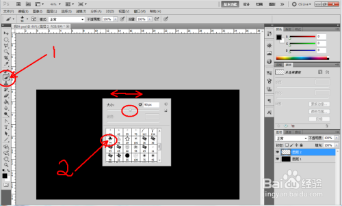 点击【画笔东西】,在作图区域点击鼠标右键,弹出设置窗口,选择枫叶画笔(注:做过找不到,点击对话框右上角小三角按钮,进行添加画笔),并恰当调好画笔笔触大小;