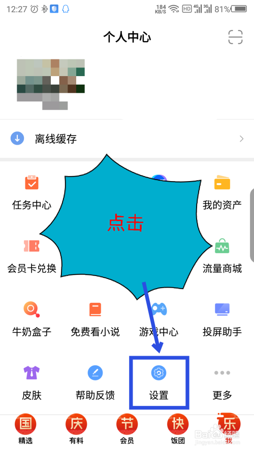 在我的界面,滑脱手机屏幕,点击最下面的设置选项。如图所示