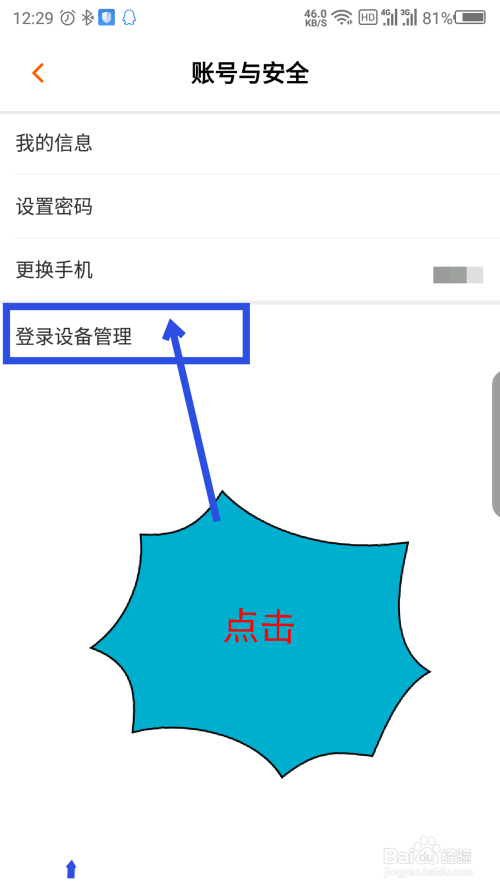 在账号与平安界面,点击最下面的登录设备办理选项。如图所示