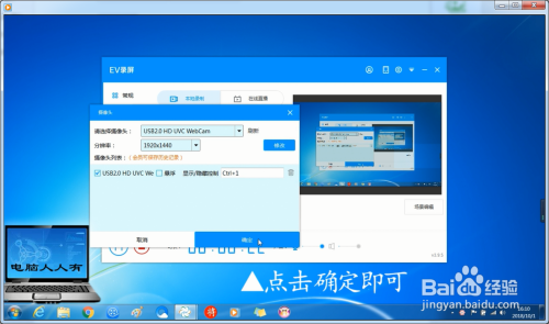 之后就会主动弹出摄像头的设置画面,可以选择摄像头(若是有多个摄像头设备的话),还可以调整分辩率。