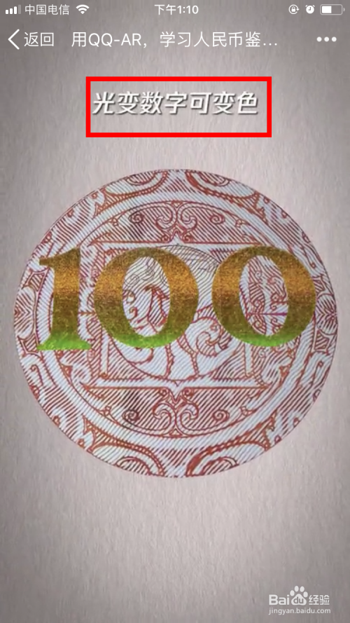 然后,将屏幕瞄准一张第五套面值100元的人平易近币。这时,从人平易近币中就会飞出一只用人平易近币做的凤凰。