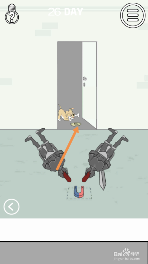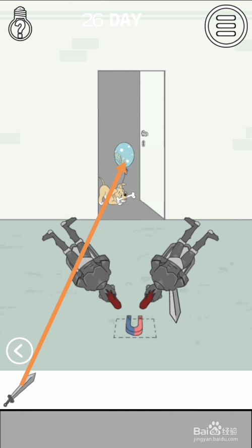 在右边房间里,将磁铁拖动到下图中箭头标注的位置,然后点击剑。