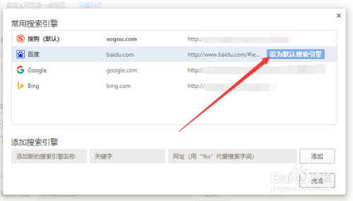 将鼠标移到百度那栏后面的网址那边,它会弹出一个【设为默认搜刮引擎】,我们点击它