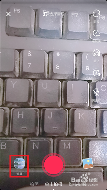 点击后会打开视频录制界面,这时我们要找到并点击左下角的【道具】选项。