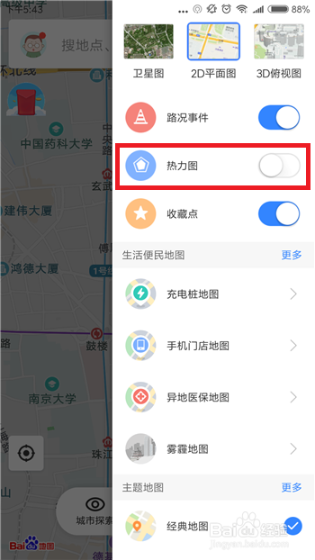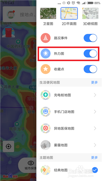 打开热力地图后可以看到在左侧的地图中已经呈现了转变,这个就是热力地图。