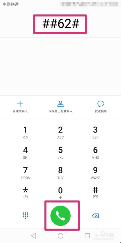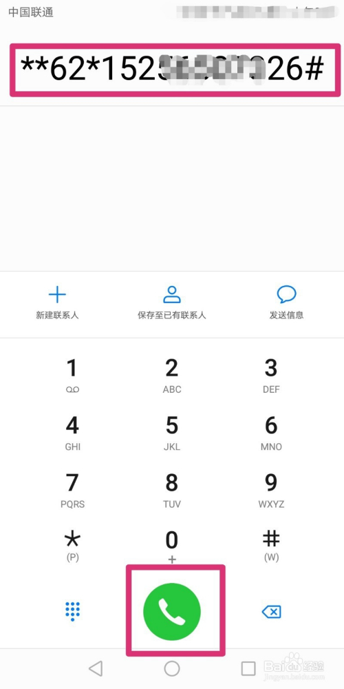 在手机拨号页面输入——**62*被转移号码#,然后按通话键将此指令拨出,如下图所示。