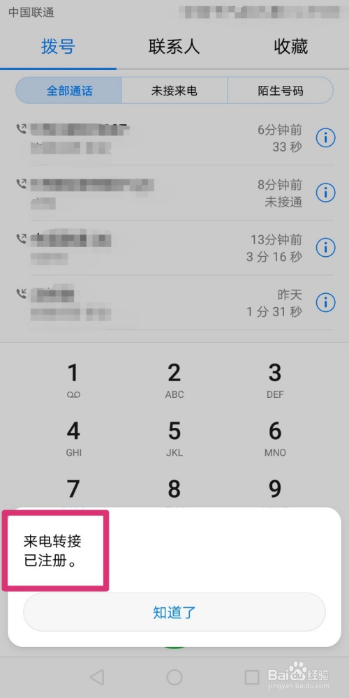 稍微期待个几秒,会主动跳转到如下图所示页面,显示“来电转接已注册”。