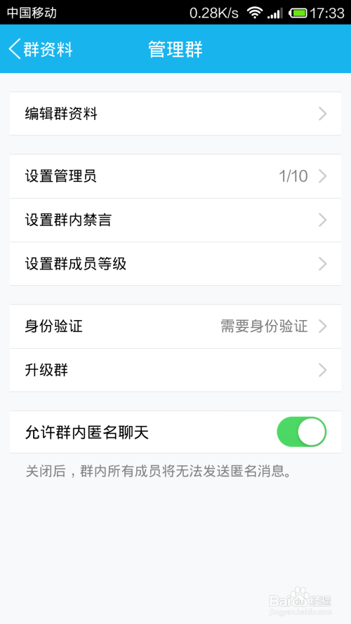 最后,我们在群办理的最后一个选项就可以看到“许可QQ群匿名聊天的设置”啦,点击开启之后,群当作员即可匿名聊天。关于怎么匿名聊天,接待大师点击下面的链接查看。http://jingyan.baidu.com/article/ad310e80a8f2891848f49e70.html