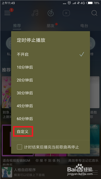 点击后会打开按时遏制播放的设定界面,我们可以选择固定的时候,当然想要本身设按时间需要点击【自界说】。