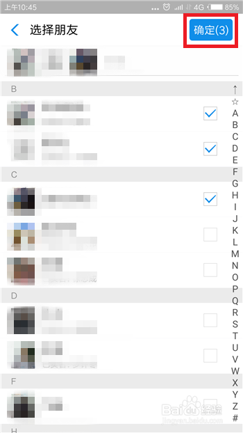 点击后会打开付出宝的联系人界面,在后方选中想要屏障的老友(可以选择多个老友),选择好后点击右上角的【确定】。