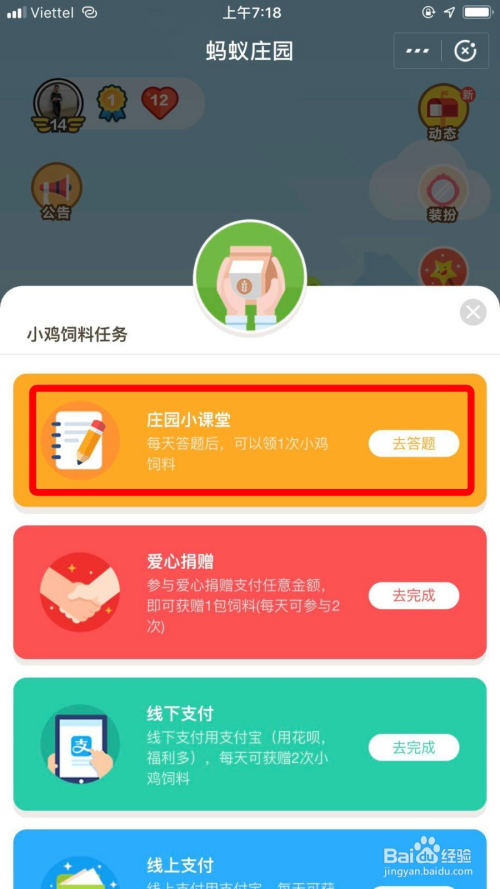 第二步:在“蚂蚁庄园”应用的左下角“领饲料”里面“庄园小讲堂”,答对后可获得180g饲料。