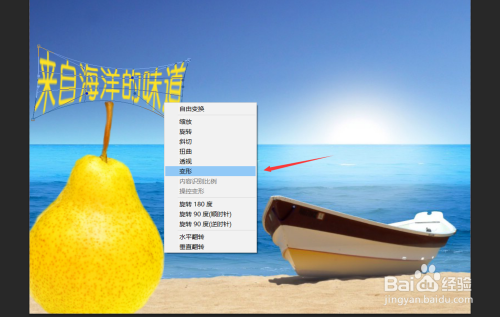 再接着我们利用文字东西,为海报添加文字。添加文字内容为“来自海洋的味道”,然后将文字内容栅格化,然后再利用变形东西将其变为凸面图形。如下图所示。