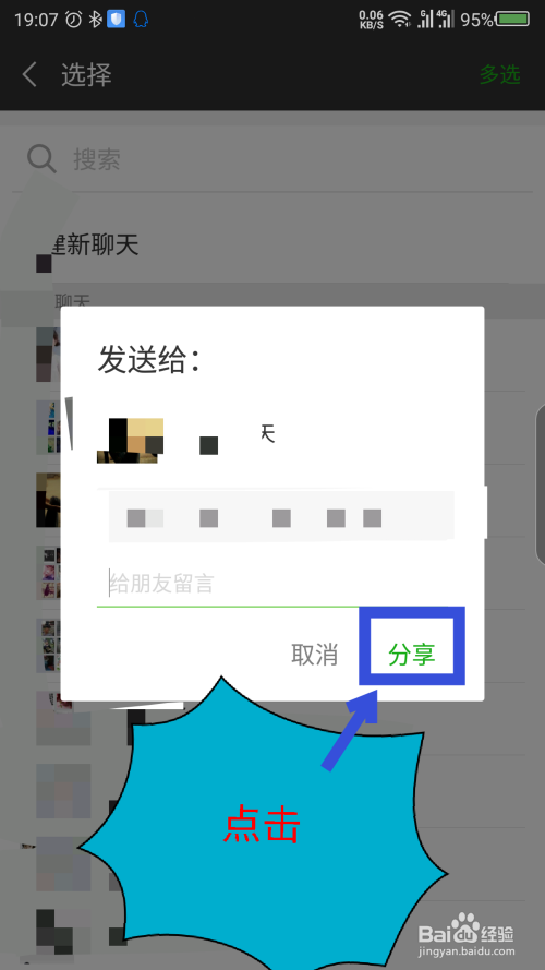 点击老友后,弹出一个窗口,也可以留言,点击右边的分享。如图所示