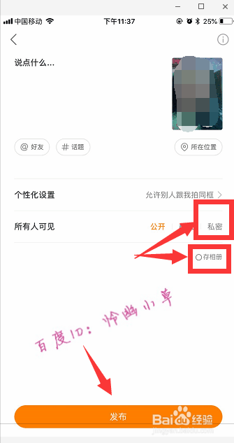 若是不想在快手上发布,可以点击“私密”,只有本身可见,勾选存相册,然后点击“发布”,最后将存到相册中的视频传到抖音就可以了。