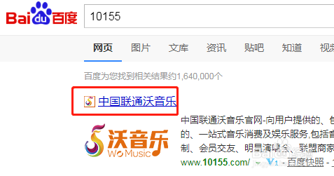 打开百度,在搜索框里输入“10155”,找到中国联通沃音乐网站并点击进去。