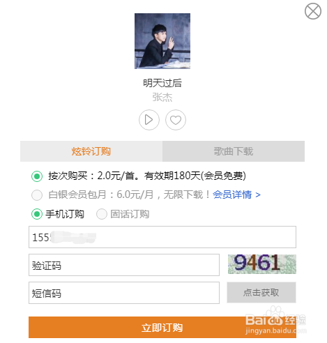 试听对劲后,点击歌曲后面的“铃声”,可以获得订购炫铃对话框,如下图所示,有明白的价钱及利用刻日。