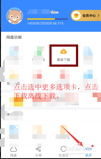 操作二:登入百度云盘APP软件,在界面上点击更多选项卡,在网盘功能点击--离线下载,操作图片步调如下。