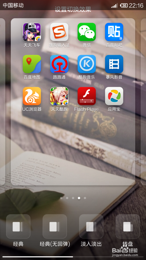 点击进入“屏幕切换”,然后便可以设置桌面的选项页切换模式,好比淡入淡出,转盘,翻页等模式,点击即可选择。