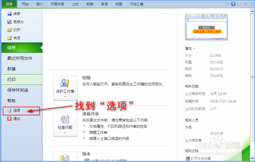 打开Excel软件,点击”文件“菜单,在扩展框中找到”选项“。如图所示: