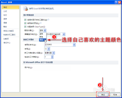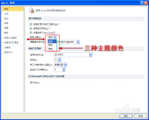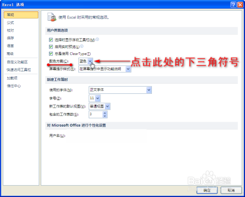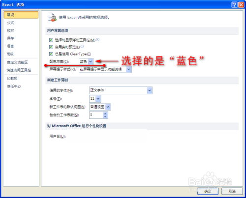 再点击对话框中的”常规“选项,然后在对话框的右侧找到”配色方案“项目。这时我们会发现”配色方案“右侧方框中选择的是”蓝色“,因为Excel今朝的本家儿题颜色就是蓝色。
