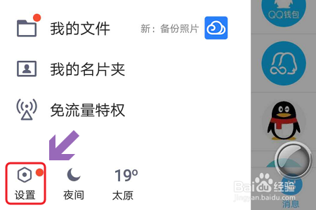 点击头像之后软件的左侧会弹出一个窗口,该窗口的左下角有一项“设置”;