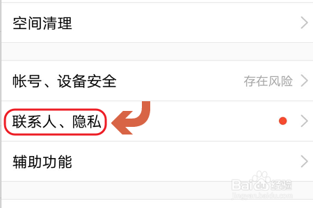 点击此项即可在设置界面中找到“联系人、隐私”选项了,如图一...点击今后在新页面找到“动态权限设置”;