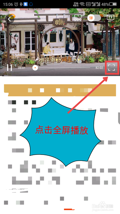 在视频播放界面,点击播放的视频右下角的全屏播放。如图所示